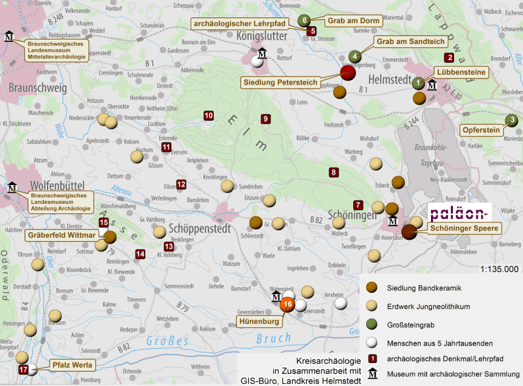 In dichter Folge und aus unterschiedlichen Himmelsrichtungen inspiriert sind nach den Eiszeiten große mitteleuropäische Kulturen vertreten. Ab 5500 v. Chr. siedelten die ersten Bauern der Bandkeramik auf den hervorragenden Böden im Süden des Landstrichs. Das 4. vorchristliche Jahrtausend ist durch faszinierende Landschaftsmonumente geprägt. Dies sind zunächst riesige Grabenringe – sogenannten Erdwerke – als Mittelpunkte von Wirtschafts- und Ritualgemeinschaften, später die imposanten Großsteingräber als heilige Orte der Ahnenverehrung. Dabei sind die Lübbensteine bei Helmstedt die bekanntesten und eindrucksvollsten Monumente. In der Bronzezeit um 1000 v. Chr. bestand an der Hünenburg bei Watenstedt ein Herrschaftszentrum mit florierendem Metallhandwerk, das in dieser Zeit als eine der Drehscheiben des europaweiten Verkehrs- Handels- und Ideennetzes gelten darf.